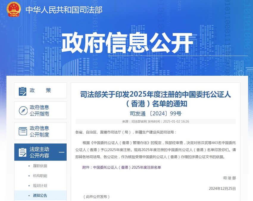 司法部關(guān)于印發(fā)2025年度注冊的中國委托公證人(香港)名單的通知